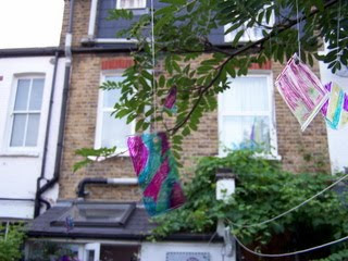 I cut the plastic into shapes and we then used permanent marker pens to totally cover the plastic shapes in multi colours. Hole punch them and make a hanging loop with your thread and….voila! Recycled suncatchers in 10 minutes! Having recently done Amelia Critchlow’s Experimental Art E-Course, I am quite tempted to do a whole batch and hang them on trees in the neighbourhood as an experiment in guerilla art!