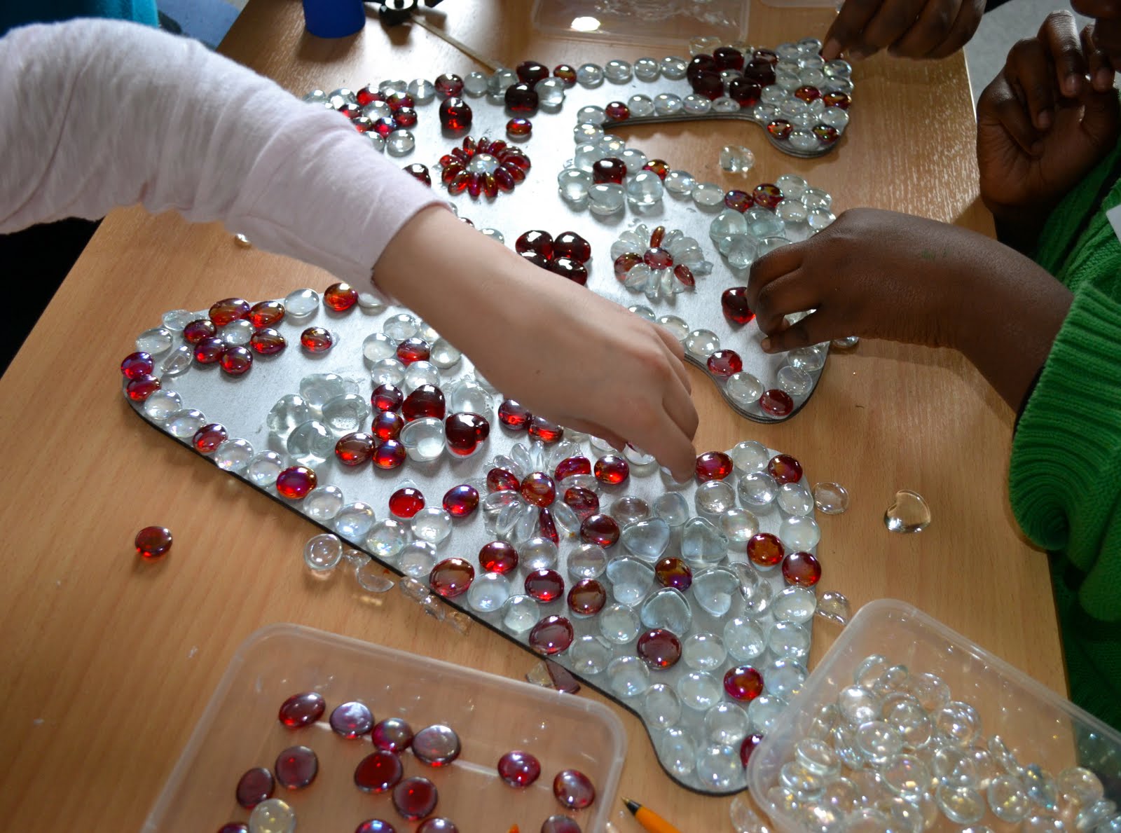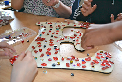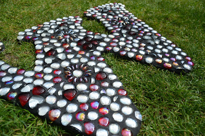 For two solid days (and a few round the edges by yours truly) the group glued a huge variety of tiles on the giant letters (this included nuggets, vitreous tiles, millefiore and soft glass – great for working with kids). It was great fun and took me back to my youth & social work days!
