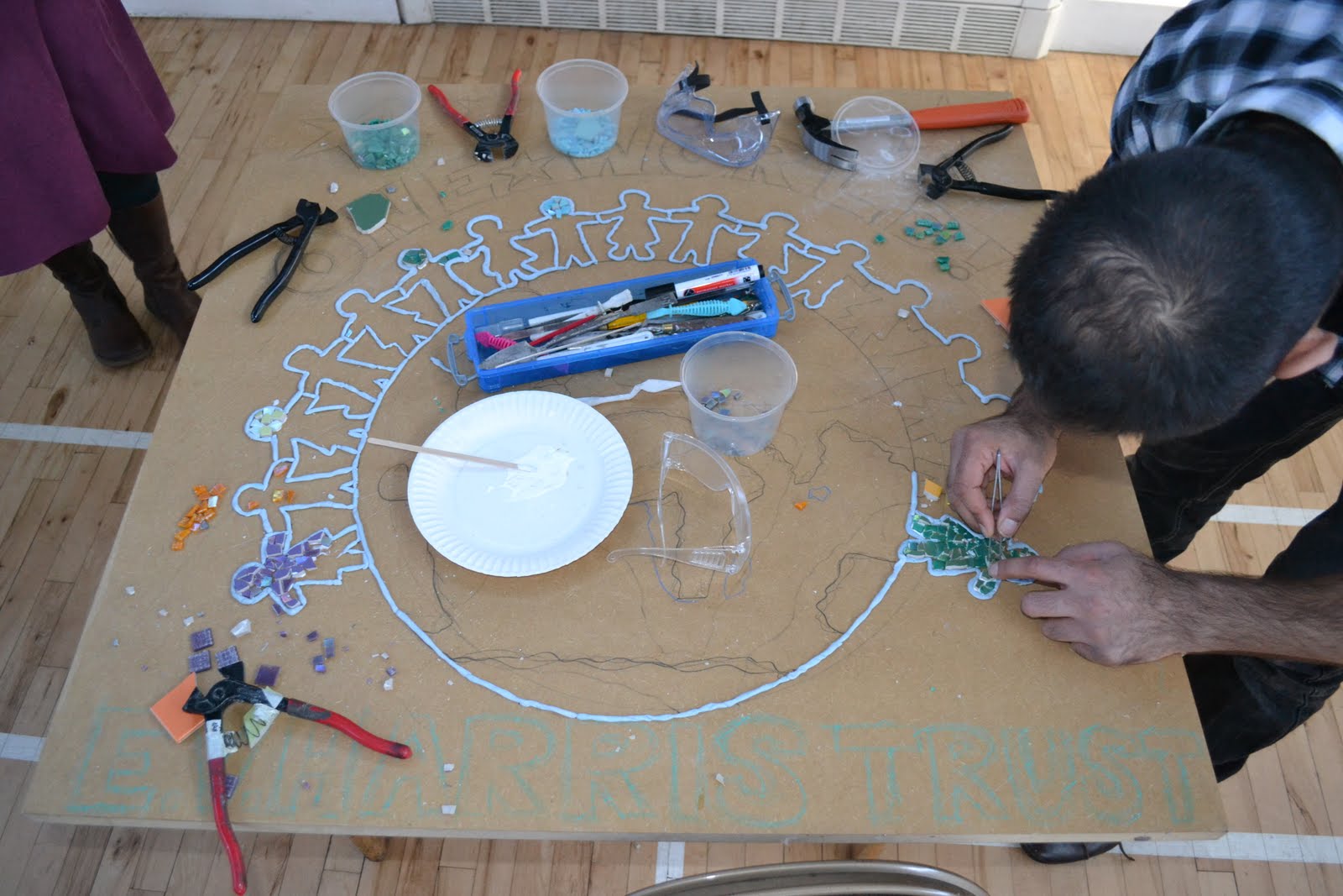 The feedback from these wonderful people (aged 3 – 91, from a wide range of cultures) was so touching. “We never thought we could do something like this, but you came along and showed us and without realising it, we were doing it!” And a great job they did (and worked soooo hard to boot). There are tiles left over, the group has caught the mosaic bug and the next projects are being plotted and planned!