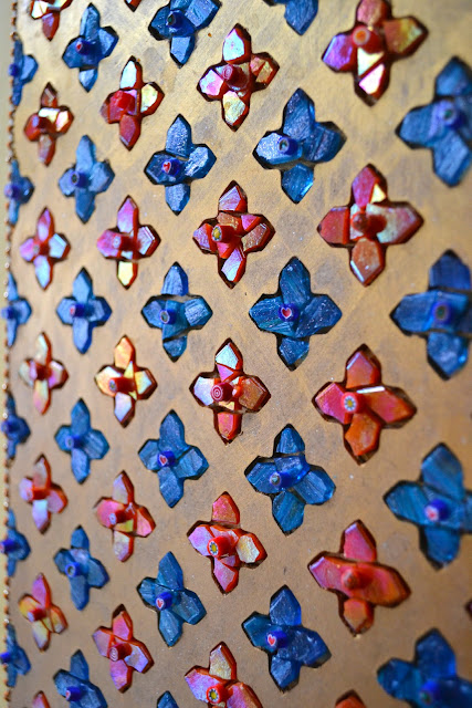 Now…for years I have wanted to experiment with using wooden fretwork as a kind of ‘grout’ and this was my chance – fretwork with the Gothic quatrefoil all over… (the Gothic quatrefoil is an architectural symbol seen in so many buildings here in London). I brushed the fretwork with a gold paint wash then carefully glued my pieces in the recesses. Et voila’ – it worked! Why don’t you give it a go with whatever fretwork you can get your hands on?